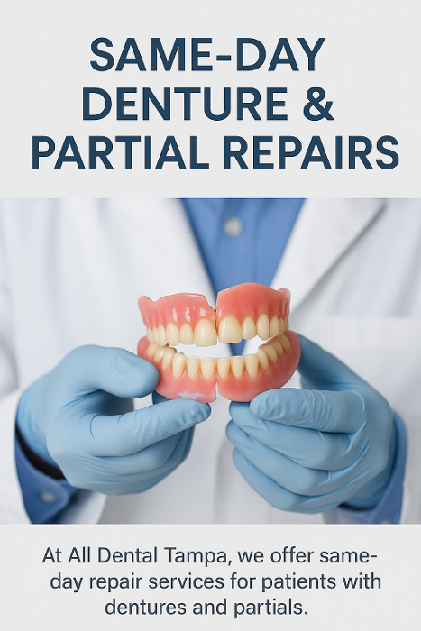 At All Dental Tampa, we understand how important your smile is—especially when you rely on dentures or partials. That’s why we offer same-day repair services to get you back to smiling, eating, and speaking confidently without delay.